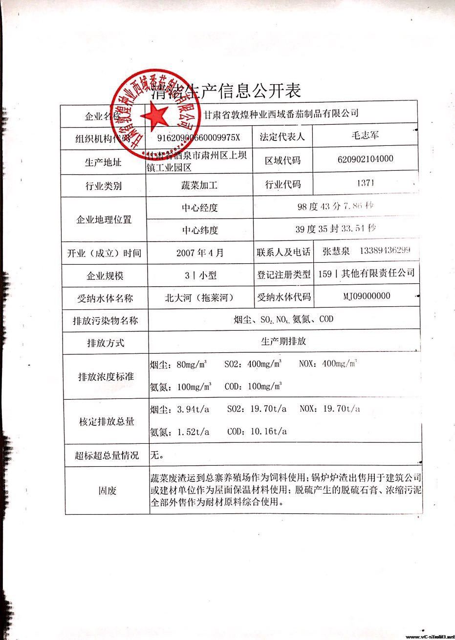 甘肅省敦煌種業(yè)西域番茄制品有限公司清潔生產(chǎn)信息公開表